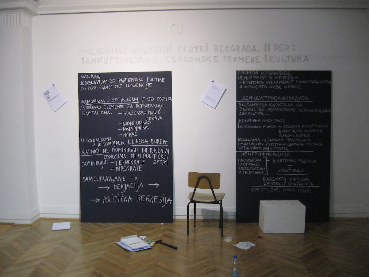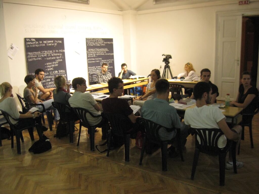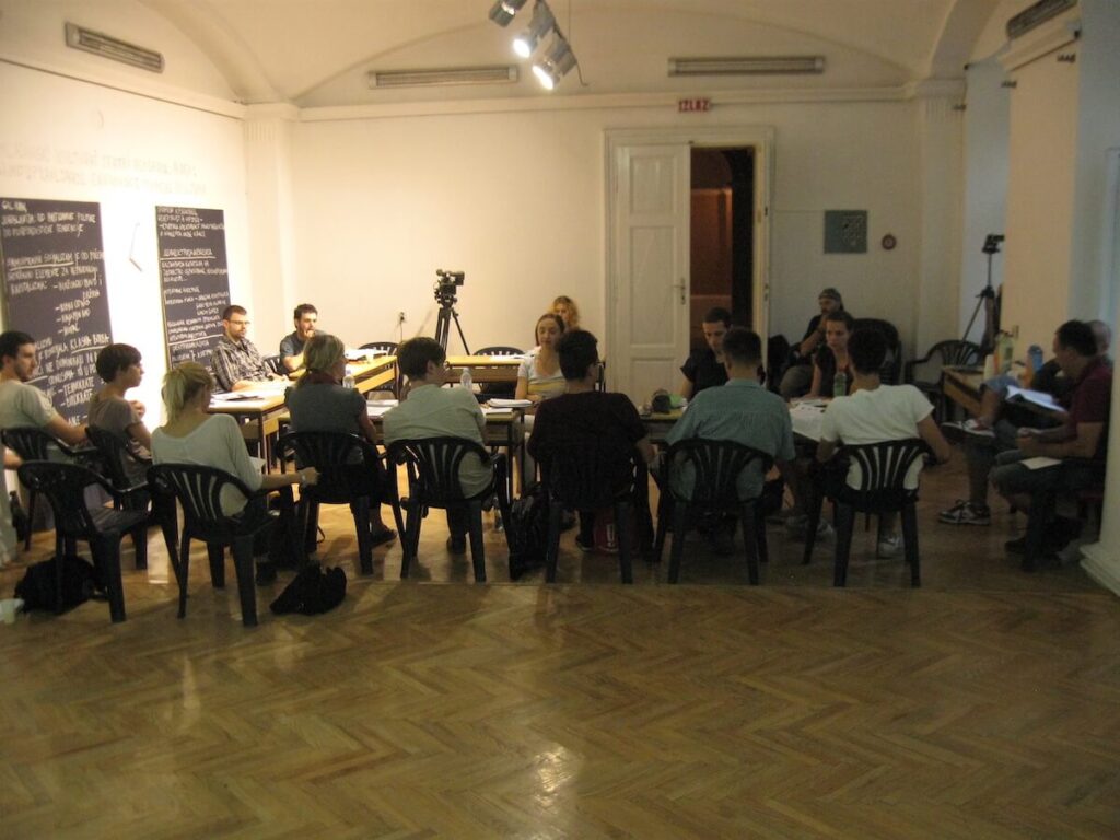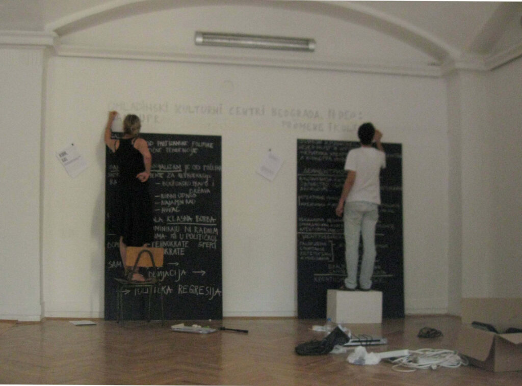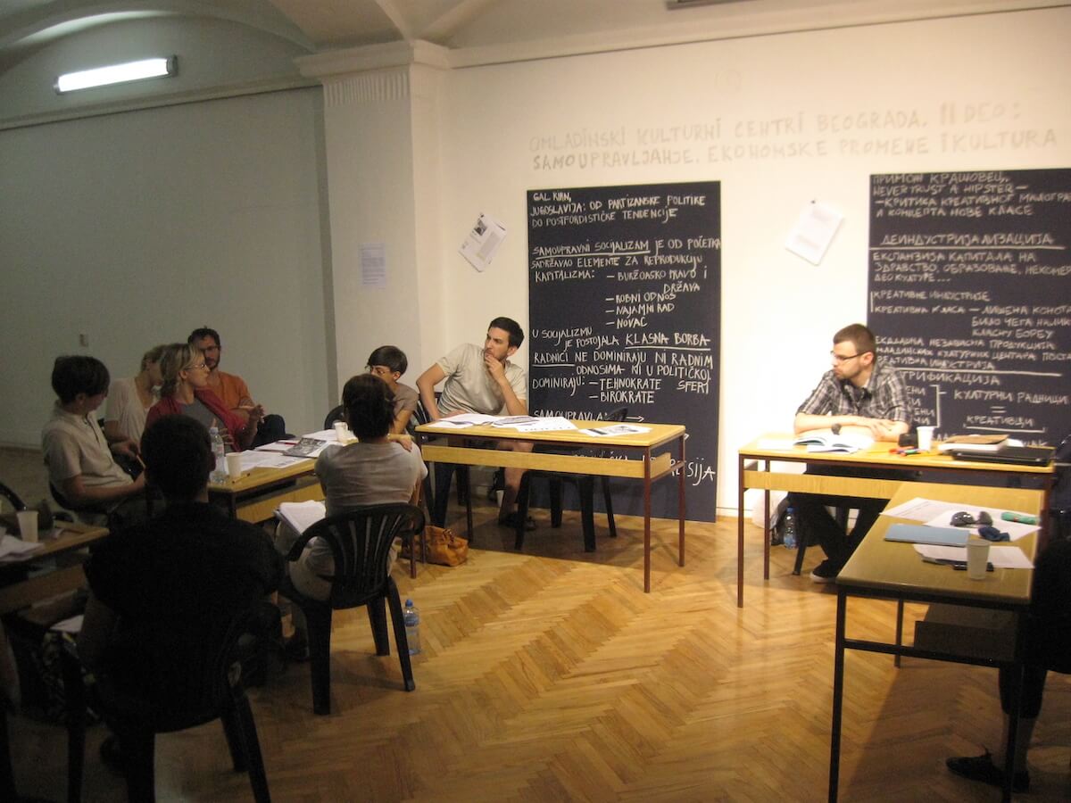 The conversation was held as part of the program of the Biennial of Arts in Pančevo under the title “Youth cultural centers of Belgrade. Part II: Self-management, economic changes and culture” and is a continuation of the work we started in the workshop “Youth cultural centers of Belgrade” organized during May and June 2012. The topic of the workshop and discussion is the process of transformation of youth cultural institutions created during socialist Yugoslavia into institutions of the national neoliberal capitalist state. A whole series of institutions in the former Yugoslavia were initiated with the aim of opening space for the youth; let’s mention just a few: Belgrade Youth Center (1964), Student Cultural Center, Belgrade (1968); Cultural Center “Student City”, Belgrade (1971); they were created as a result of the socialist cultural policy that firmly linked culture and education. Although these institutions were not founded with the same goals, they all showed strong support for alternative and autonomous artistic production, especially the younger generation, for a very long time. However, due to various, often contradictory, political and economic changes that marked the entire self-governing period, the mentioned institutions over time distanced their work from the principles on which they were founded.
