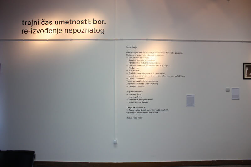Na izložbi „Trajni čas umetnosti: Bor. Re-izvođenje nepoznatog“ je predstavljena umetnička produkcija Bora, koja nastaje u rascepu između „kreativnosti“ i postindustrijske realnosti. Ona otvara pitanja na koji način umetnost proizvodi i upotrebljava određene simboličke vrednosti bazirane i „crpljene“ iz društvenog, ekonomskog i istorijskog konteksta i kako se odnosi prema datoj realnosti. U novim okolnostima, takva umetnička praksa – koja detektuje, ironizuje i kritikuje društveno stanje, dok istovremeno omogućava prostor imaginacije i politike – postaje nepoželjni znak koji upozorava na greške i koji se ne uklapa u projektovane slike kreativnosti. Njeni autori kao „proizvođači” bivaju marginalizovani, što nam otvara pitanja o položaju umetnika i uslovima u kojima oni rade.